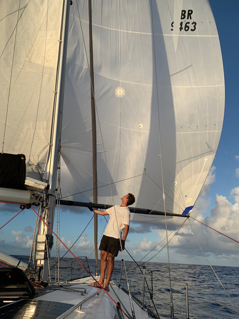 She runs down the trades effortlessly under twin running headsails, but has up her sleeve a long carbon spinnaker pole and four spinnakers for those moments when the competition appears on the horizon.